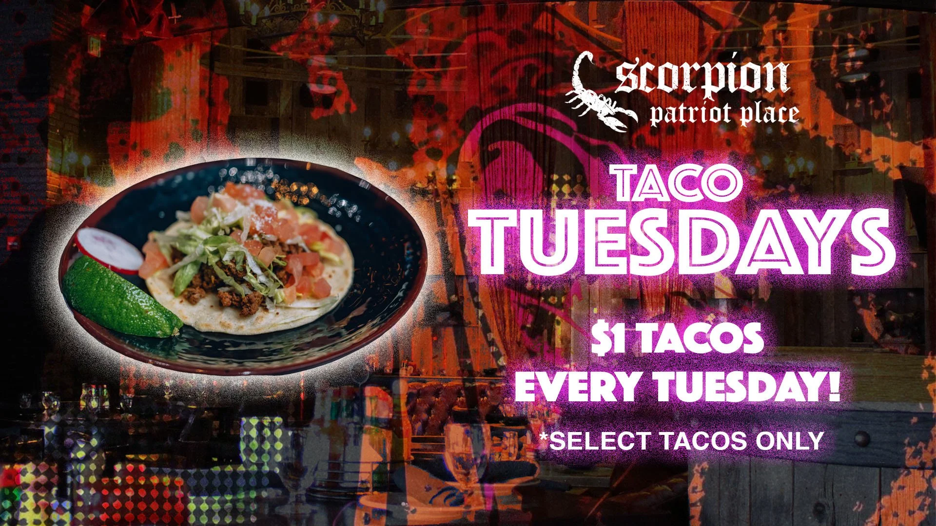Located in the heart of Foxborough’s Patriot Place, Scorpion Bar offers innovative Mexican cuisine with a twist and a distinct cocktail program in the ideal setting. The 7,800 square foot venue holds up to 420 guests, including both public and private indoor areas and two outdoor patios, and boasts unique features like a 200” HDTV, 50-foot white organic stone bar, and custom-made décor that will transport guests to the streets of Mexico. Scorpion Bar is the perfect location for lunch, dinner, nightlife or your next private event.