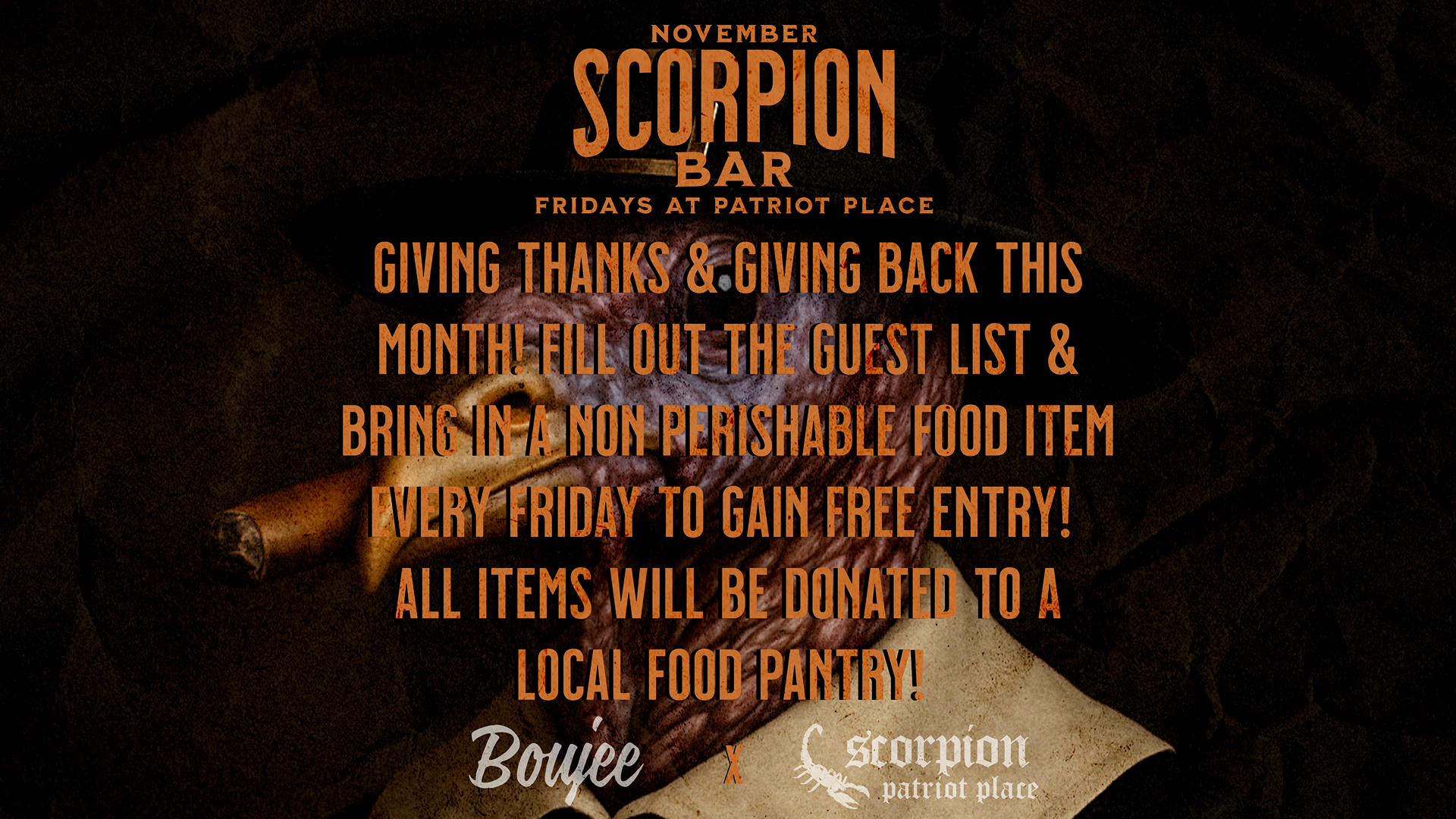 Located in the heart of Foxborough’s Patriot Place, Scorpion Bar offers innovative Mexican cuisine with a twist and a distinct cocktail program in the ideal setting. The 7,800 square foot venue holds up to 420 guests, including both public and private indoor areas and two outdoor patios, and boasts unique features like a 200” HDTV, 50-foot white organic stone bar, and custom-made décor that will transport guests to the streets of Mexico. Scorpion Bar is the perfect location for lunch, dinner, nightlife or your next private event.